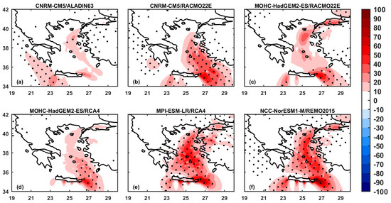 Composite differences between the future period (F3: 2070–2099) according to the rcp8.5 scenario and the reference period (historical period: 1970–2005) for each one of the RCM simulations (a–f). The dots denote the statistically significant differences at the 95% level (Student’s t-test).