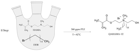 The final step of the synthesis was the addition of QAHAMA-12 to diisocyanate (Figure 3). A 50% solution of QAHAMA-12 and DBTDL in CH2Cl2 was introduced to a 250 mL three-neck round-bottom flask. The flask was equipped with a dropping funnel, reflux condenser, and thermometer. The mixture was brought to the boiling point of CH2Cl2 (approx. 42 °C), and then a 50% solution of diisocyanate was dropped into the boiling mixture for 1.5 h. The exact amounts of substrates and other chemical substances used in the final step are presented in Table 3.