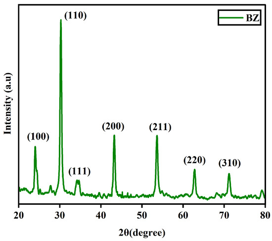 The XRD pattern of barium zirconate (BaZrO3) mentioned as BZ is shown in Figure 1. It can be confirmed that the prepared sample exhibited a perovskite structure. The most intense peak was found in reflection (110) and this was used to determine the crystalline size. The XRD pattern with sharp peaks is in good agreement with (JCPDS data # 06–0399) [4].