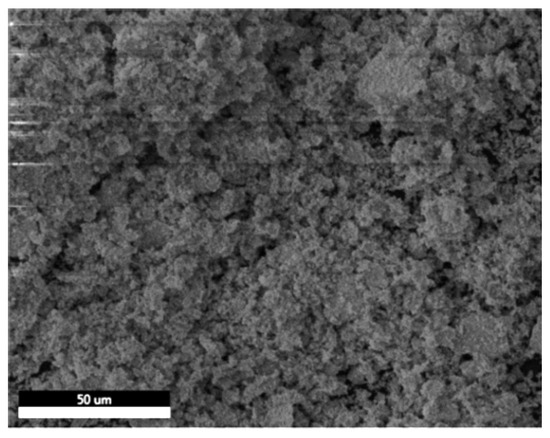 SEM-EDX was utilized to examine the morphology and the elemental composition of the prepared barium zirconate sample (BaZrO3). Figure 2 shows the SEM image recorded at a scale of 50 μm. The image illustrates the dense distribution of the processed sample with an irregular and agglomerated morphology forming a porous rough structure. These pores are present even after manually grinding the sample for 4–5 h.