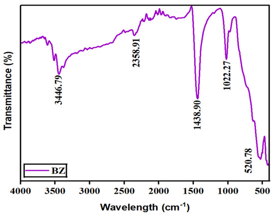 Fourier-transform infrared spectroscopy (FTIR) was used to reveal the bonding and phase composition of the prepared barium zirconate sample. Figure 4 displays FTIR spectra ranging between 4000 and 500 cm−1. In the spectra, a prominent band at around 520 cm−1 is ascribed to the stretching vibrations of metal–oxygen (Zr–O) octahedra, which conforms the perovskite structure (ABO3) [10]. A sharp peak at 1438.90 cm−1 is due to the vibrations produced by Ba–O [11]. An additional band seen in 2358.91 cm−1 is because of the absorbance of CO2 from the air. The presence of water molecules in the fabricated material is recorded by the wide absorption band at 3446 cm−1. Thus, the presence of bands once again confirmed that the prepared sample has a perovskite structure.