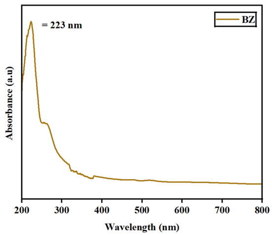The absorbance spectra for the synthesized barium zirconate material were investigated by UV–visible (DRS) spectroscopy. Figure 5 depicts the spectra deducted at a wavelength range of 200–800 nm. At 223 nm, a single absorbance peak was detected, which might result from charge–transfer mechanisms in BaZrO3 electronic transitions associated with oxygen vacancies. Also, the energy bandgap (Eg) was calculated using Tauc’s plot relation and is displayed in Figure 6. An energy bandgap of 3.5 eV was evaluated for the prepared barium zirconate, which is a good match with the existing literature: 3.52 eV [10] and 3.55 eV [12].