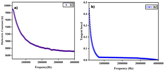 From Figure 7a, it is very clear that the dielectric constant reaches a maximum at a decreased frequency and a minimum at a higher frequency range. This constantly decreasing value of the dielectric constant while the frequency is increasing is connected with Maxwell–Wagner theory which is due to interfacial polarization [4]. This trend of high values at low frequencies can be due to the dislocations, oxygen vacancies, and defects present in the sample [8]. The different kinds of polarizations such as interfacial, orientation, ionic, and electronic, are the reason for a great dielectric constant value at a lower frequency. Then, the value slowly decreases at an elevated frequency where the relaxation effect takes place, and at certain points, it becomes constant, which is due to the delay in electron jumping [10]. The same trend of a decreasing constant at a higher frequency is seen in previously reported research [10,13]. The dielectric constant ꜫ of the perovskite-structured barium zirconate was found to be 9897.22. This value is greater than previously reported values: 4500 [9], 6500–7000 [10], and 1000 [14].