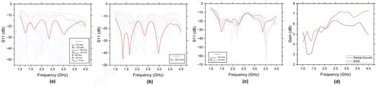 (a) Simulated return loss (S11) of inverted U-shaped patch antenna with optimised dimensions. (b) Simulated return loss (S11) with optimised partial ground plane length (). (c) Simulated return loss (S11) of antenna with DGS. (d) Comparison of antenna gain between partial ground plane and DGS configuration. Note: The light gray lines in (a–c) show simulated return loss (S11) from parametric simulations, while the red line indicates the optimised return loss for the final dimensions.