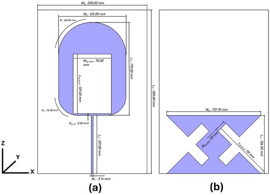 The initial dimensions of the inverted U-shaped patch () and the rectangular slot () were based on the reference design in []. These dimensions were selected on the basis of their suitability for UWB applications. The length of the partial ground plane was initially set equal to the length of the feed line .