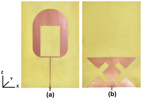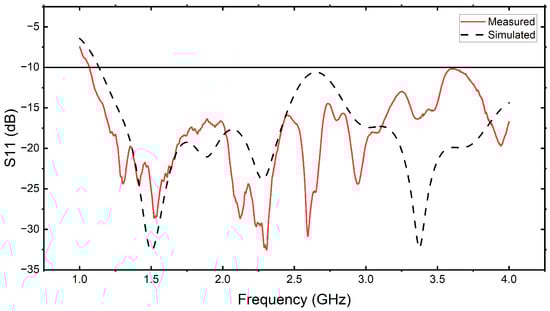 The antenna was fabricated on an FR4 substrate to validate its real-world performance, as shown in Figure 3a, which shows the radiating patch, and Figure 3b, which illustrates the ground plane. Experimental measurements were performed using the Keysight FieldFox N9923A VNA. The results show that the antenna achieved a return loss below −10 dB in the operational frequency band from 1.068 to 4 GHz. A return loss below −20 dB is observed between 1.367 and 1.675 GHz, indicating minimal power reflection in this frequency range. Furthermore, the lowest return loss is observed at 2.30 GHz (−32.53 dB), while 1.52 GHz also exhibits a significant return loss of −28.60 dB.
