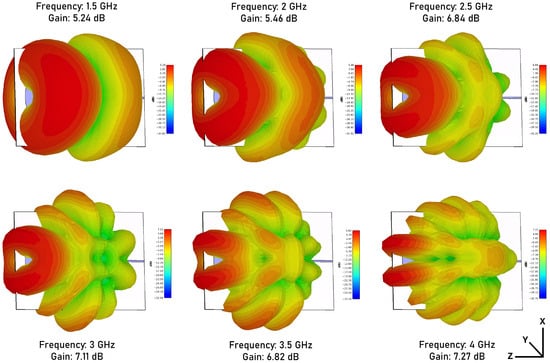 The simulated 3D radiation patterns of the antenna at different operating frequencies (1.5 GHz, 2 GHz, 2.5 GHz, 3 GHz, 3.5 GHz, and 4 GHz). The corresponding peak gain values are indicated for each frequency, showing variations in radiation characteristics across the band.