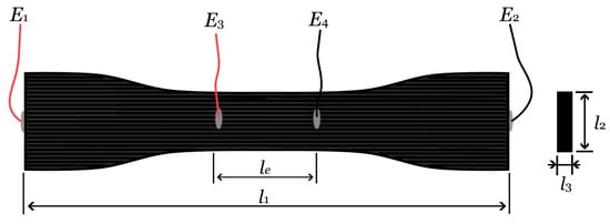 As shown in Figure 2, the specimens were equipped with four electrodes. For the measurement of electrical resistance using the two-probe method, only the central electrodes and are used. The central part of the specimen has a constant cross-section with a width and height . The electrodes are separated along the length by a distance . For the four-probe method, the electrodes and are considered. In this method, and , known as the current electrodes, apply the current, while the voltage drop is measured using the electrodes and .