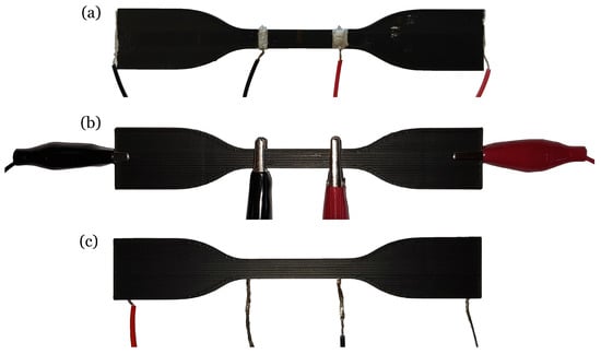 Normalized tensile testing specimen with different variants of electrical connections (bonding): (a) Silver paste and silver paint; (b) crocodile clips; (c) inlaid during printing.