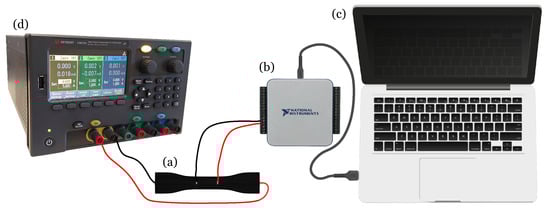 Illustration of the experimental setup for the four-probe measurement with the DAQ system from National Instruments: (a) 3D-printed normalized conductive PLA specimen; (b) National Instruments USB 6002 DAQ system; (c) computer with DAQ Express software for signal acquisition and manipulation; (d) KeySight E36312A power supply.