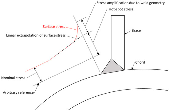 Offshore jacket platforms, a cornerstone in marine and subsea resource exploration, rely on circular hollow section (CHS) steel members for their exceptional structural performance [1,2,3]. These structures exhibit high compressive strength, torsional resistance, and direction-independent characteristics, making them a preferred choice for offshore applications like oil and gas facilities and wind energy installations [4,5,6]. CHS members are interconnected through welded tubular joints, which serve as critical load-bearing elements. However, the complex geometry of these joints results in significant stress concentrations, particularly under cyclic environmental loads and prolonged service, making them prone to fatigue cracks [7,8]. Such cracks, if unaddressed, can propagate, compromising structural integrity and leading to potential catastrophic failure [9,10,11]. While nominal member stresses may remain within allowable limits, the geometric variation at the tubular joint causes unequal deformation, and the presence of a weld notch leads to considerable stress amplification [12]. This behavior is illustrated in Figure 1. This phenomenon makes CHS joints the most critical component of tubular structures.