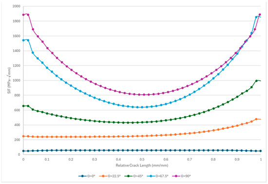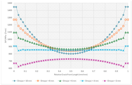 Larger cracks exhibit pronounced stress concentrations at the tips, with SIF curves peaking prominently, as shown in Figure 4. Conversely, smaller cracks demonstrate a more uniform stress distribution, with a reduced SIF at the tips and relatively higher values along the crack middle. This behavior stems from stress redistribution and the plastic zone characteristics around smaller cracks, which reduce stress intensity at the crack tips. For instance, cracks with 2 mm major diameters recorded a peak SIF at their center, unlike larger cracks. These observations corroborate Subbaiah and Bollineni’s [20] findings on cylindrical pressure vessels.