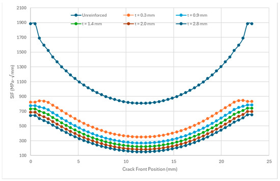 Applying CFRP reinforcement significantly reduces SIF values, with the first CFRP layer lowering the SIF by 53.4%. Further thickness increases yield diminishing returns; for instance, increasing CFRP thickness from 2.0 mm to 2.8 mm results in only a 6% SIF reduction, as shown in Figure 5. This trend highlights the load redistribution capabilities of CFRP and the material’s finite stress absorption capacity. Excessive CFRP thickness should be assessed based on joint severity, cost, and additional weight implications.