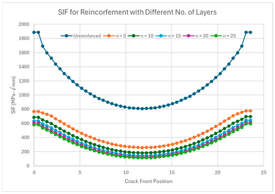 Incremental increases in CFRP layers also reduce the SIF, with the initial layers achieving substantial reductions (e.g., 58.5% for five layers), as shown in Figure 6. However, beyond a certain point, additional layers yield marginal reductions, as seen when increasing from 20 to 25 layers (3% reduction). Optimal reinforcement takes into consideration the anisotropic properties of CFRP, with the 0° fiber orientation being most effective for axial tension.