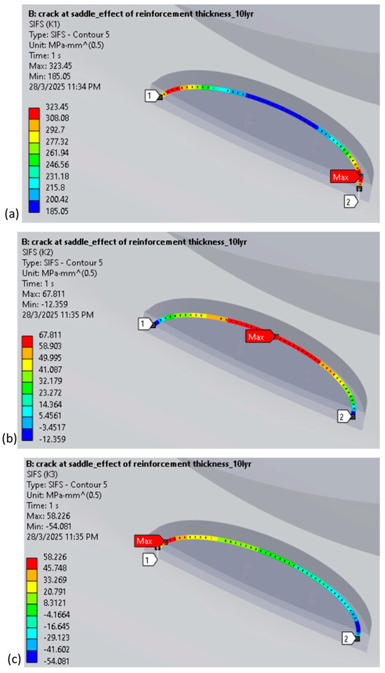Contours of SIF: (a) K1, (b) K2, and (c) K3.
