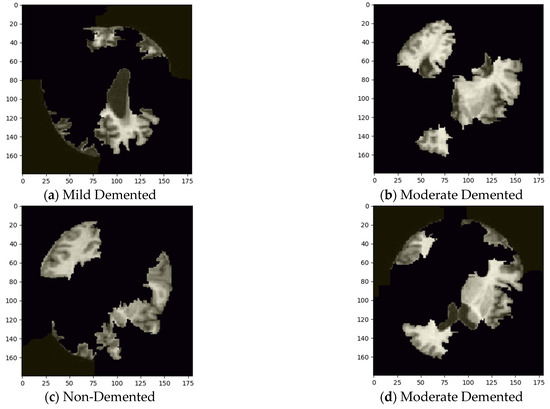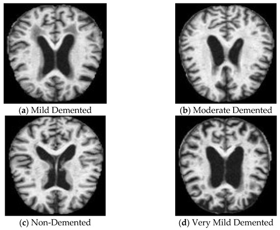The data used for the experiment comprise the Alzheimer’s MRI dataset, obtained from Kaggle [16]. It comprises 6400 MRI scanned images of the brain, divided into four classes: class 0 (Mild Demented), class 1 (Moderate Demented), class 2 (Non-Demented), and class 3 (Very Mild Demented) of 128 × 128 pixels each. Figure 1 shows sample images from each class of the dataset. As part of the preprocessing steps, pixel values were normalized to a range of [0, 1], a technique that aids in the faster convergence of DL models by scaling the inputs. Following normalization, the dataset was split into three subsets, allocating 80% for training, 10% for testing, and 10% for validation. The training dataset contains 5120 images; the testing and validation datasets contain 640 images each.