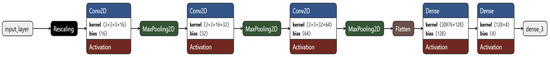 The custom CNN architecture consisted of three convolutional layers with increasing filters of 16, 32, and 64 to capture low-level features in early layers and more complex patterns in deeper layers [18], and ReLU activation functions [19], each followed by max-pooling layers to reduce spatial dimensions and extract dominant features. ReLU activation was chosen based on its ability to mitigate the vanishing gradient problem. These were succeeded by a flattened layer, followed by two dense layers, containing 128 and 4 neurons each [8]. The final layer with four neurons employed a softmax activation function to yield probabilities for the four classes (Figure 2 and Figure 3).