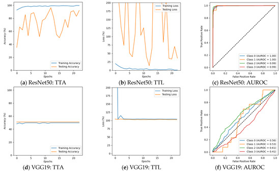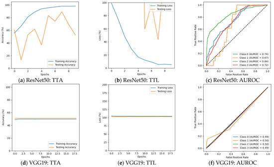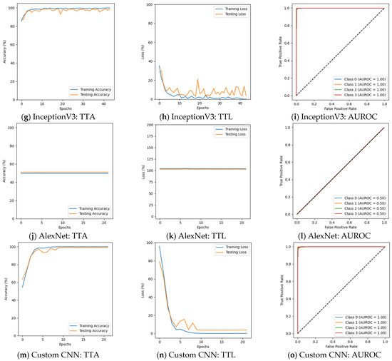 Figure 6 depicts that the performance of several models changed, with some benefiting while others experienced a decline in performance in the second phase of the experiment. ResNet50 could not perform well, particularly for Moderate Demented cases, where its F1 score declined from 100% to 63%. The precision for this class fell from 100% to 55%, while recall dropped from 100% to 75%. Despite these declines, the model maintained a strong classification for Non-Demented and Very Mild Demented cases. Its validation accuracy was 69.64%, with a validation loss of 1.2924, suggesting that ResNet50 struggled to adapt to augmented data. The results are presented in Figure 6a–c and Table 4. VGG19 continued to show weak classification performance, failing to classify Mild Demented, Moderate Demented, and Very Mild Demented cases, as shown in Figure 6d–f. Its validation accuracy remained nearly unchanged at 50.94%, with validation losses above 1.0. InceptionV3 continued to generalize well, with F1 scores remaining above 91% for all classes. A decline in recall for Moderate Demented cases, dropping from 100% to 93%, slightly impacted its overall classification performance. The validation accuracy of InceptionV3 decreased slightly to 96.56%, with a validation loss of 0.1271. The results are given in Figure 6g–i. AlexNet faced challenges in distinguishing Mild Demented, Moderate Demented, and Very Mild Demented cases. However, it consistently identified Non-Demented cases with an F1 score of 67%, demonstrating its ability to recognize certain patterns in the data. It achieved a validation accuracy of 49.84% with a validation loss of 1.0244. The results are summarized in Figure 6j–l and Table 4. The custom CNN model showed superior performance, achieving 100% F1 scores for both Moderate Demented and Very Mild Demented cases, while maintaining precision and recall above 98% for all other categories. Its validation accuracy slightly improved to 99.53%, with a validation loss of 0.0238, and achieved an AUROC of 100% on Mild and Moderate Demented cases. The results are shown in Figure 6m–o and Table 4 and Table 5.