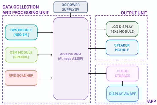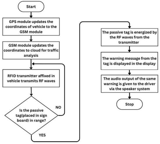 The processing unit is the Arduino UNO, which has the Atmega328p microcontroller, which is interfaced with the RFID reader, GPS, 3G, etc. It has a flash memory of 32 Kilo BITS and runs at 16 MHz of clock speed; hence, it achieves real-time data processing and communication of functional units. With the GPS module, we receive real-time vehicle location updates, and the GSM module makes cloud connectivity possible for dynamic updates and alerts. The key in enabling the functionality of the system under diverse environments lies in these modules. To alert the driver, the system integrates an LCD display and speaker. The audio output is universal and multi-lingual, and the visual display improves driver awareness. Power is provided from a 5V DC power supply either from the auxiliary battery or engine. The installation of solar panels exists to boost energy efficiency and sustainability. Figure 7 illustrates the flowchart of the system of the proposed invention. Figure 8 demonstrates the component description of the scaled down prototype, and the components are listed in Table 2.