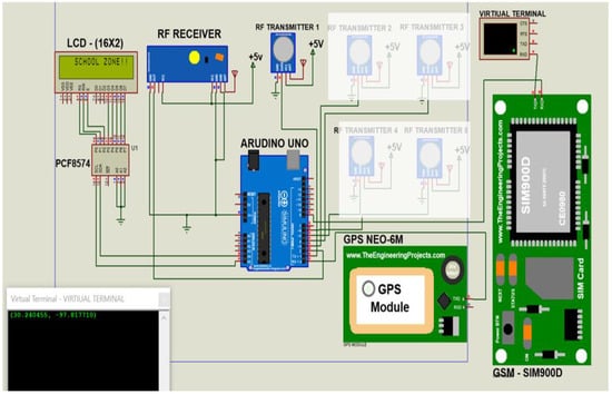 The UNO is the processing unit; it powers the required sensors including the GPS, GSM, RFID, and LCD display. In Figure 3, Transmitter 1 is powered, and it transmits the encoded data which is burned into it to the receiver, where the message isdecoded, and the output is seen in the display as “SCHOOL ZONE”. The output for the location module can be seen through the virtual terminal.
