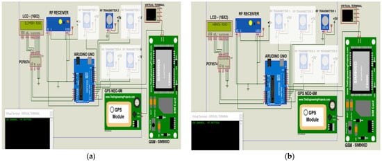 In Figure 4b, Transmitter 3 is powered, and it transmits the encoded data which is burned into it to the receiver, where the message is decoded, and the output is seen in the display as “NARROW ROAD”. The output for the location module can be seen through the virtual terminal.