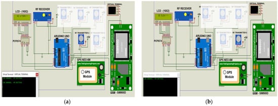 Five tags in total are included in the simulation results. Each tag’s output is shown on the liquid crystal display. The output for the different warnings is shown in the simulation results from Figure 3, Figure 4 and Figure 5.