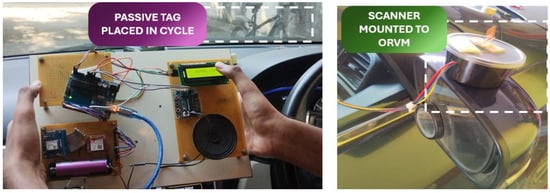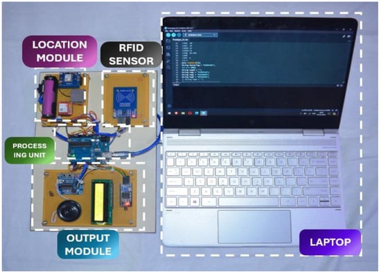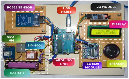 A scaled down prototype of the proposed system is depicted in Figure 6; it is presented with its integration of RFID technology with IoT enhanced GPS and GSM modules for sensing and alerting the driver about the road signs in real time. The RC522 reader module was replaced with M7E-TERA-CB RFID during real-world testing;this is a passive UHF RFID reader, which scans with passive UHF RFID tags integrated into road safety signboards. It has a claimed operating frequency of 865–928 MHz with maximum read range of up to 7 m and is suitable for high-speed applications.
