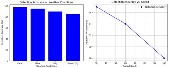 Extensive real-world testing across a variety of weather conditions—from clear, rain, fog, and dense fog to speeds of 0–100 km/h across urban, rural, and tunnel environments—was used to validate the system’s performance. Figure 9 represents the real-time testing of the proposed system with the M7E-TERA-CB sensor. All data was logged through a Raspberry Pi 4 taking in detection events, response times, and GPS coordinates. Tags were placed at 10 m intervals along prescribed routes, and each testing scenario is evaluated over 10 trials. In particular, the system obtained 98% accuracy under clear weather, with robust baseline performance. However, in moderate rain (25 mm/h), signal attenuation and a decrease in accuracy to 95% were observed; in dense fog (visibility < 50 m) accuracy decreased further to 85% as shown in Figure 10. The challenges encountered in fog included a 4.2% false positive rate (due to signal reflections) and a 10.8% missed detection rate due to signal degradation from the tags. Accuracy as a function of speed is shown in Figure 10 and decreases from 97% at 30 km/h to 88% at 100 km/h, though mostly due to read range limitations of less than 15 m. In rural environments, the accuracy achieved through environmental testing was 96%, while in urban zones (affected by RF interference from buildings), it was 92%, and in tunnels (GPS denied condition), 89%.