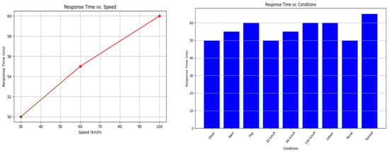 Evaluation was also performed at various speeds. Figure 11 represents the response time for different weather conditions and different speeds. The detection accuracy dropped from 97% to 88% at 100 km/h, indicating that there was a need to reduce the system response time and increase the read range especially for high-speed applications. System performance was, however, affected by environmental factors. In rural areas, the system performed best, at 96%; it also faced difficulties in urban areas (92%) and in tunnels (89%). Finally, the results highlight the importance of interference and GPS-denied zones.
