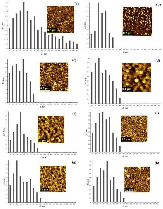 AFM image and granulometry of ablated cerium dioxide nanoparticles (a) from a dispersed solution without sequential dispersion and centrifugation; (b) from dispersed solution N1; (c) from dispersed solution N2; (d) from dispersed solution N3; (e) from dispersed solution N4; (f) from dispersed solution N5; (g) from dispersed solution N6; (h) from dispersed solution N7.