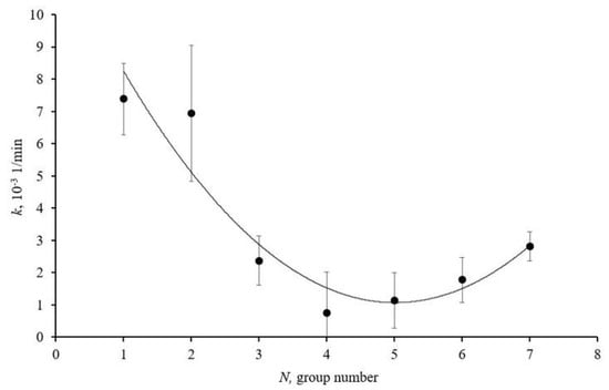After the photocatalytic reaction, the oxidation reaction rates were calculated for all systems. Subsequently, the reaction rates in systems containing cerium dioxide nanoparticles were determined by subtracting the reaction rate without cerium dioxide nanoparticles from the rates observed with nanoparticles, taking the rates with an opposite sign. The resulting reaction rates were then normalized to the concentrations of the cerium dioxide nanodispersed solutions previously obtained. This approach was used to evaluate the antioxidant efficiency of ablated cerium dioxide nanoparticles for each size group.