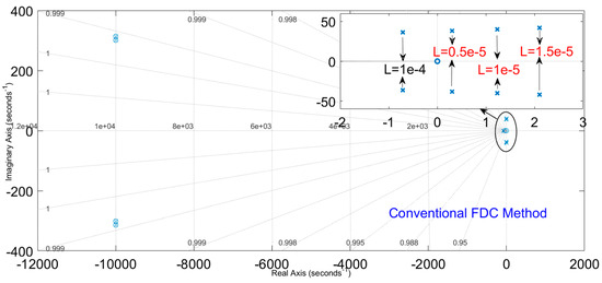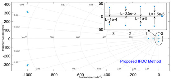 By considering the full range of AD, i.e., −5e−5 to 5e−5, it is observed from Eigenvalue analysis that with the conventional FDC method, with large inductive loads, the system is driven to instability as seen in Figure 1. In Figure 1, for values of loads greater than those corresponding to 1e−4, the poles of the system are going to the right half of the s-plane. From Figure 2, which represents the case of the proposed IFDC method, all the poles of the system remained in the left half of the s-plane for values of loads greater than those corresponding to 1e−4, thus ensuring stability.