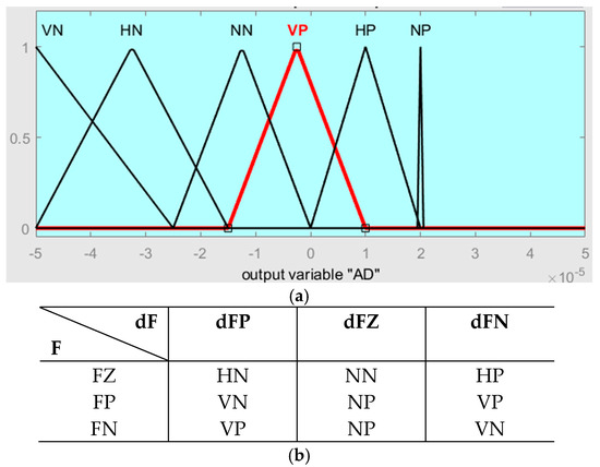 Design of the proposed IFDC method: (a) membership functions of the output variable AD; (b) fuzzy rule base.