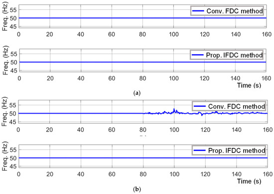 Frequency results with the conventional FDC method and with the proposed IFDC method: (a) during test case T1; (b) during test case T2.
