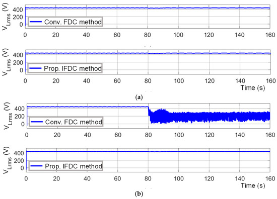 Voltage results with the conventional FDC method and with the proposed IFDC method: (a) during test case T1; (b) during test case T2.