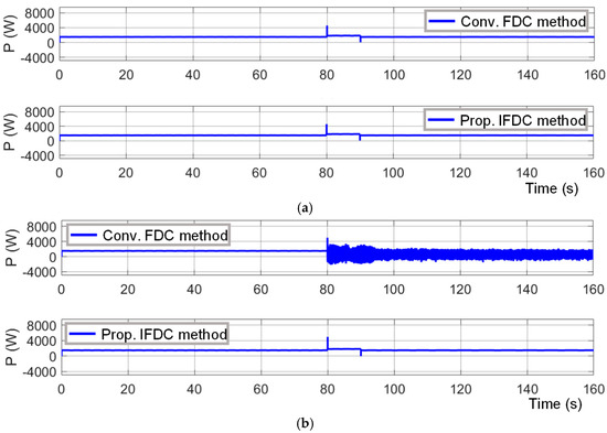 Active power results with the conventional FDC method and with the proposed IFDC method: (a) during test case T1; (b) during test case T2.