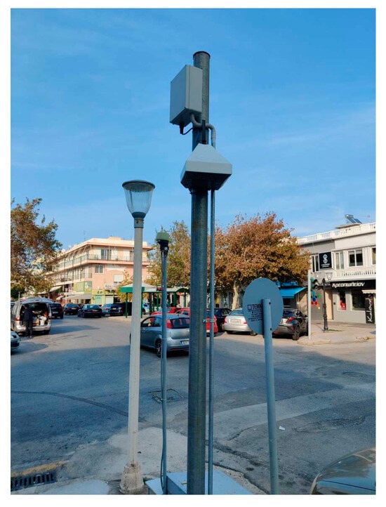 For this campaign, a calibrated AQ-Mesh mobile air quality monitoring system (AQMS) equipped with air quality and meteorological sensors is employed. In general, the use of air quality monitoring systems (equipped with LCSs) provides a solution to monitor the concentration and variability of pollutants in areas that have not been previously investigated. LCSs have attracted the interest of the scientific community because the new digital technologies increase the efficiency of sensors, in combination with their affordability and mobility. In this context, LCSs can be an alternative for air quality monitoring in regions where there are not any stable, labor-intensive, and expensive air quality systems [,,,,,,]. In addition, the development of sensor technology involves innovative solutions to the field of air quality monitoring due to their ability to develop networks of LCSs providing high spatiotemporal coverage []. Nevertheless, LCSs have lower accuracy and precision in capturing the absolute values of pollutant concentrations compared to stable and authorized labor air quality instruments. In addition, environmental factors, such as temperature and humidity, can reduce the desirable accuracy of LCSs, affecting their response to these (meteorological) conditions [] due to their possible impact on the electrochemical elements of (electrochemical) sensors such as and . Furthermore, particle growth due to water absorption can affect the accuracy of measurements in optical PM10 sensors.
