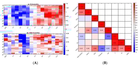 (A) (a) The hourly DI anomalies with reference to the whole period mean diurnal DI cycle and (b) the hourly AQHI anomalies with reference to the whole period mean diurnal AQHI cycle. (B) Pearson correlation (r) among the ratio, concentration of pollutants, and meteorological factors. Only the significant lattices at 95% are denoted with the correlation coefficient value.