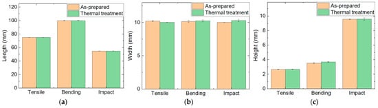 Figure 1 shows an example comparison of the dimensions of all samples prepared from HPP 52ShD before and after thermal treatment in the climate chamber. While the average lengths before thermal treatment ((75.03 ± 0.11) mm for tensile tests, (99.97 ± 0.23) mm for the bending tests, and (54.85 ± 0.04) mm for the impact tests) are largely consistent with the theoretically defined lengths, the values after thermal treatment are consistent with the as-prepared samples within the measurement accuracy. Measurements of the other samples gave very similar results.