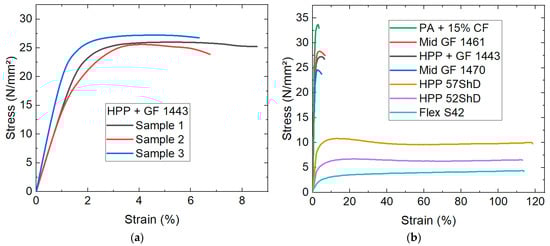 Results of tensile tests (a) for sample HPP + GF 1443, comparing the measurements on the three as-prepared samples; (b) comparing average measurements on the different materials.