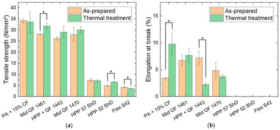 Comparison of (a) tensile strength and (b) elongation at break for the as-prepared and the thermally treated tensile samples. Missing values indicate that the samples did not break until the maximum elongation of approx. 115%, as defined by the tensile tester, was reached. Statistical differences are denoted as * (p < 0.05).