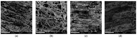 The fracture surfaces recorded in the SEM which are shown in Figure 4 for the as-prepared tensile test samples do not show any major differences, either. Typical failure mechanisms in such fiber–matrix composites are matrix deformation and fracture, fiber-matrix debonding, fiber pull-out, and fiber fracture []. No fiber fracture is visible here. Instead, the images show several holes due to pulled-out fibers, while the matrix shows partial ductile failure as expected, as well as localized viscous stretching of the matrix between the fibers []. Nevertheless, the microscopic images indicate another potential problem that may influence the elongation at break, namely the surface roughness due to the fibrous filling of all four brittle samples. As the large error bars in Figure 3b already indicated, the elongation at break measurements are not highly reproducible, which suggests that future tests should be performed on larger quantities of samples, printed under well-defined environmental conditions, where the printing parameters are changed one by one to investigate which parameters affect the surface and, potentially, the mechanical properties of these fiber/polymer composite samples the most as well.