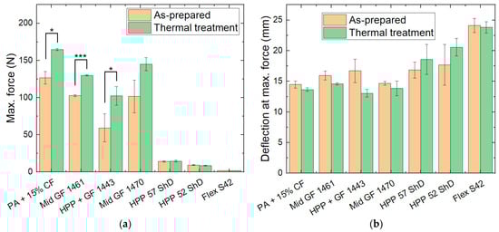 Comparison of (a) maximum force and (b) deflection at maximum force for the as-prepared and the thermally treated bending samples. Statistical differences are denoted as * (p < 0.05) or *** (p < 0.001), respectively.