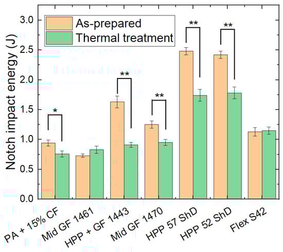 Comparison of the notch impact energy for the as-prepared and the thermally treated impact test samples. Statistical differences are denoted as * (p < 0.05) or ** (p < 0.01), respectively.