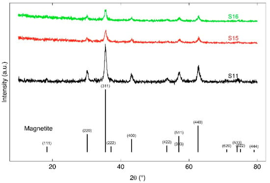 XRD patterns of nanomagnetite-coated biochar powders prepared for 6 h at 200 °C employing: magnetite nanoparticle (S11), 0.18 mm (S15), and 0.38 mm (S16) biochar particles.