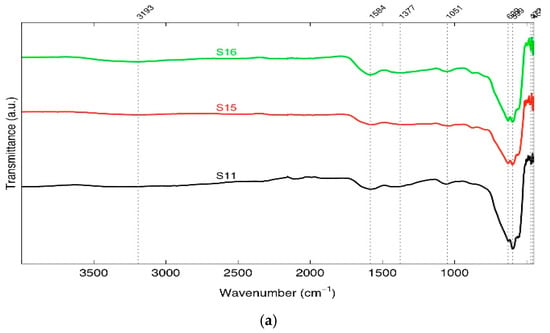 The FTIR spectra for samples S11, S15, and S16 are presented in Figure 2a. All three samples show a broad adsorption band around 3193 cm−1, which is indicative of O-H stretching vibrations, likely due to the presence of water or hydroxyl groups adsorption on the surface. Additionally, they display a band at around 1051 cm−1, which is attributed to C-O stretching vibrations. There is also a common peak around 1584 cm−1, corresponding to C=C vibrations. Finally, all three samples show distinct peaks in the 400–600 cm−1 range, which are assigned to the Fe-O stretching vibrations characteristic of magnetite [].