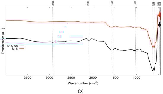 The FTIR analysis (Figure 2) reveals that all three samples contain magnetite, as shown by the presence of the Fe-O bands []. The broad O-H band at 3193 cm−1 indicates the presence of hydroxyl groups or water adsorption on the surface of all the samples. While the intensity of Fe-O bands is slightly lower in S15 and S16 compared to S11; there is an increase in the band at 1377 and in the band 1051, this is also observed in 1584 and 3193. This confirms that the surface composition of S15 and S16 has more carbon-based groups than S11. The FTIR analysis before and after arsenic adsorption on sample S15 strongly suggests that the removal of arsenic involves a combination of mechanisms, primarily surface complexation with hydroxyl and carbonyl/carboxyl groups present on the nanomagnetite-coated biochar, as well as direct binding to the magnetite surface [,]. The biochar component enhances the availability of oxygen-containing functional groups, while the magnetite nanoparticles provide specific binding sites for arsenic species, leading to the high adsorption capacity observed for sample S15.