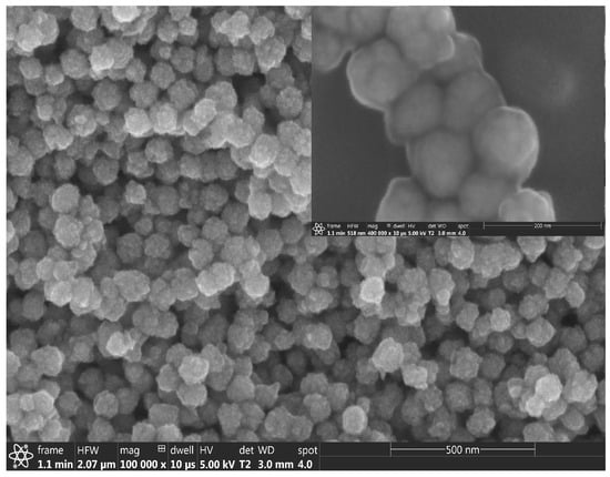 The scanning electron microscopy (SEM) image (Figure 3) of sample S15, a nanomagnetite-coated biochar synthesized at 200 °C for 6 h, reveals a morphology characterized by homogeneous, spherical particles. These particles exhibit a predominantly spherical shape, indicating a relatively uniform growth process during solvothermal synthesis. The inset image provides a zoomed-in view of these particles, highlighting their smooth and rounded surfaces []. Particle size, as observed, is in the nanometer range, with most particles falling within the 95–115 nm range. The SEM image also shows some degree of agglomeration, with individual spherical particles tending to cluster together.