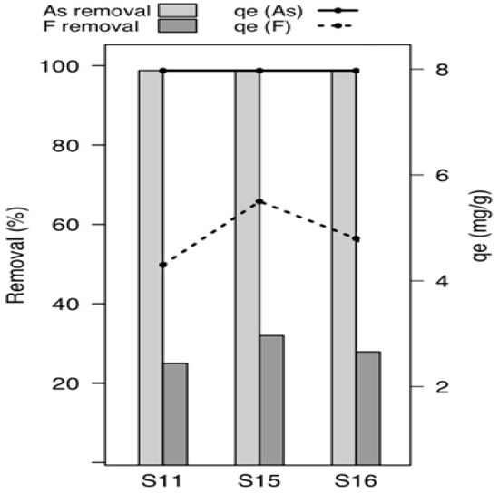 The enhanced adsorption capacity of S15 over S11 suggests that biochar, by influencing the material’s morphology and surface area, significantly contributes to arsenic adsorption, consistent with findings by Shen et al. (2021) []. The lower fluoride removal percentages, compared to arsenic, indicate that the material’s effectiveness for fluoride removal is limited under the tested conditions. Nevertheless, S15 demonstrated higher efficiency than pure magnetite (S11) and S16, further highlighting the beneficial influence of biochar. Similar observations of higher arsenic removal and lower fluoride removal using biochar were reported by Saikai R. (2017) [].