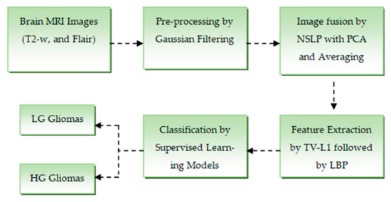 Gliomas are classified according to their location (supratentorial, infratentorial, or pontine), morphology (astrocytoma, oligodendroglioma, or ependymoma) [4], and World Health Organization (WHO) grades (I–IV) [5]. While grades III and IV are categorized as high-grade (HG), grades I and II are categorized as low-grade (LG). Among other imaging techniques, magnetic resonance imaging (MRI) has better contrast and sensitivity; therefore, it is widely used in glioma investigation. However, due to their uneven borders and fluctuating pixel intensities, gliomas are difficult to detect in MRI scans. Hence, to improve diagnostic precision, this study suggests a novel method for precisely predicting whether a glioma is LG or HG.